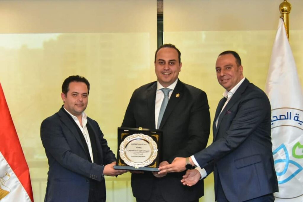 التقى الدكتور أحمد السبكي، رئيس الهيئة العامة للرعاية الصحية والمشرف العام على مشروعي التأمين الصحي الشامل وحياة كريمة بوزارة الصحة والسكان، مع المهندس أحمد جمال الزيات، المؤسس والرئيس التنفيذي لشركة إدارة الأنظمة الهندسية (EMS)، الشركاء الرسميين لشركة سمينس، والسيد وائل عمر، نائب الرئيس الأول للصناعات الرقمية بشركة سيمنس، وذلك في المقر الرئيسي للهيئة بالقاهرة.