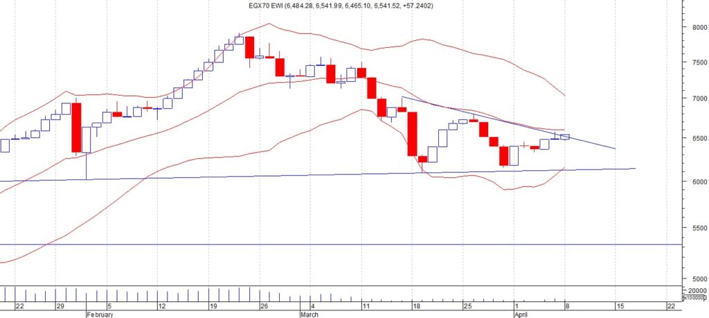 اغلق المؤشر السبعيني عند مستوى 6541 وقد تعرض المؤشر لموجه شديدة من جني الارباح خلال الاسبوع الماضي ليحقق اقل رقم عند 6150 ثم اتد المؤشر مختبرا مستوى 6700 الذي عجز عن اختراقه لاعلى نتوقع ان يستمر التارجح بين هذه المستويات وتعتبر المقاومة الرئيسية 6700 في حال اختراقها لاعلى بحجم تداول عالي والثبات فوقها فانه ستكون الاشارة لاستمرار الصعود مستهدفين 7500 نقطة وكذلك يعتبر الدعم الاهم هو المنطقة بين 6000 ثم 6200 والتي في حال كسرها لاسفل سيعاني المؤشر من موجة جديدة من الهبوط قد تصل الى مستويات 5000 – 4000 نفطة ننصح باستثمار الفرصة السانحة ويجب الالتزام بنظام حماية الارباح ووقف الخسارة السريع في حال حدوث اي تقلبات بسبب الظروف الحالية .