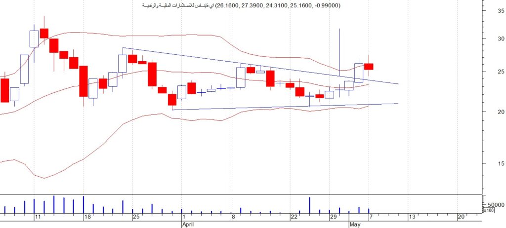 اغلق سهم اي فاينناس عند مستوى 25.16 ويتحرك السهم في اتجاه صاعد بعد كسر مستوى 23 – 24 نتوقع ان يستمر صعود السهم الى مستوى 31 جنية الذي يمثل مستهدف المثلث المتماثل الذي استطاع السهم اختراقه بنجاح والثبات فوقه نتوقع استمرا الصعودالى مستويات 27.5 ثم 31 جنية ننصح بالمضاربة بين هذه المستويات و ننصح باستثمار الفرصة السانحة ويجب الالتزام بنظام حماية الارباح ووقف الخسارة السريع في حال حدوث اي تقلبات بسبب الظروف الحالية ويتبر كسر مستوى 24 هو وقف الخسارة.