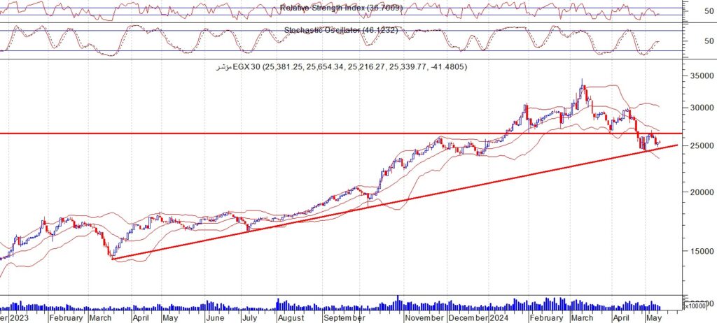 اغلق المؤشر العام EGX30 عند مستوى 25339 ويواجه المؤشر منطقة مقاومة عند 25500 ثم منطقة 26300 التي تمثل خط الرقبة لنموذج الراس والكتفين نتوقع ان يبدا المؤشر في موجة جديدة من جني الارباح الى مستويات 25000 ثم 24200 ننصح بالمضاربة بين هذه المستويات و ننصح باستثمار الفرصة السانحة ويجب الالتزام بنظام حماية الارباح ووقف الخسارة السريع في حال حدوث اي تقلبات بسبب الظروف الحالية .