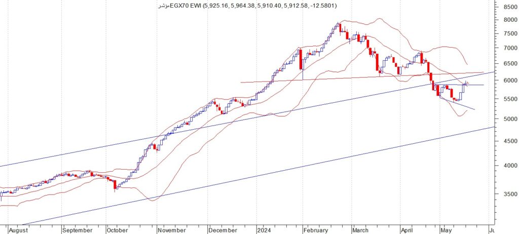 اغلق المؤشرEGX70 عند مستوى 5912 ويواجه المؤشر مقاومة صعبة عند منطقة 6000 وتعتبر المقاومات القريبة للمؤشر الان عند 6100 – 6300 حيث 6100 ( هي التي تمثل خط الرقبة لنموذج الراس والكتفين ) نتوقع ان يبدا المؤشر في موجة جديدة من جني الارباح الى مستويات 5300 ثم 5000 في حال كسر الدعم الضعيف عند مستوى 5860 والاستقرار تحته ننصح بالمضاربة بين هذه المستويات و ننصح باستثمار الفرصة السانحة ويجب الالتزام بنظام حماية الارباح ووقف الخسارة السريع في حال حدوث اي تقلبات بسبب الظروف الحالية.