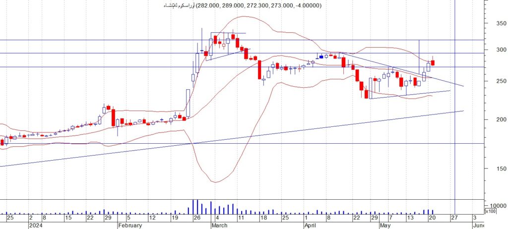 اغلق سهم اوراسكوم كونستراكشون عند مستوى 273 ويتحرك السهم فوق مستوى 271 جنية ( الذي يمثل خط دعم مهم في حال كسره فان السهم يستهدف 250 – 230 جنية ) ننصح بالبيع عند كسر هذا المستوى 271 ووقف الخسارة والا فالمقاومات هي 290 و 310 جنية على الترتيب ننصح بالمضاربة بين هذه المستويات و ويجب الالتزام بنظام حماية الارباح ووقف الخسارة السريع في حال حدوث اي تقلبات بسبب الظروف الحالية ويعتبر كسر مستوى 270 هو وقف الخسارة.