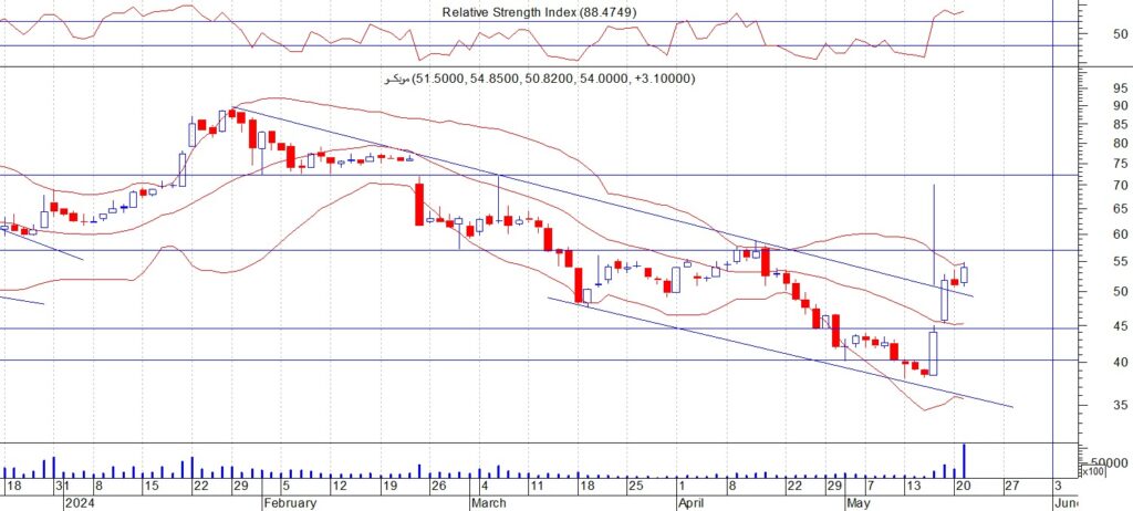 اغلق سهم موبكو للاسمدة عند مستوى 54 ويتحرك السهم فوق مستوى 50 – 52 جنية ( الذي يمثل خط دعم مهم في حال كسره فان السهم يستهدف 45 ثم 40 جنية ) ننصح بالبيع عند كسر مستوى 50 ووقف الخسارة والا فالمقاومات هي 55و 58 جنية على الترتيب ننصح بالمضاربة بين هذه المستويات و ويجب الالتزام بنظام حماية الارباح ووقف الخسارة السريع في حال حدوث اي تقلبات بسبب الظروف الحالية ويعتبر كسر مستوى 50 هو وقف الخسارة .