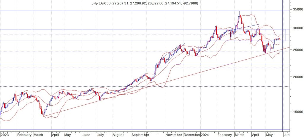 اغلق المؤشر العام EGX30 عند مستوى 27194 ويواجه المؤشر منطقة مقاومة عند 27650 ثم منطقة 28500 نتوقع ان يبدا المؤشر في موجة صعودية الى هذه المستويات قبل ان يبدا في موجه جديدة من جني الارباح الى مستويات 26300 ثم 25200 في حال كسر منطقة الدعم القريبة عند 27000 ننصح بالمضاربة بين هذه المستويات و ننصح باستثمار الفرصة السانحة ويجب الالتزام بنظام حماية الارباح ووقف الخسارة السريع في حال حدوث اي تقلبات بسبب الظروف الحالية .