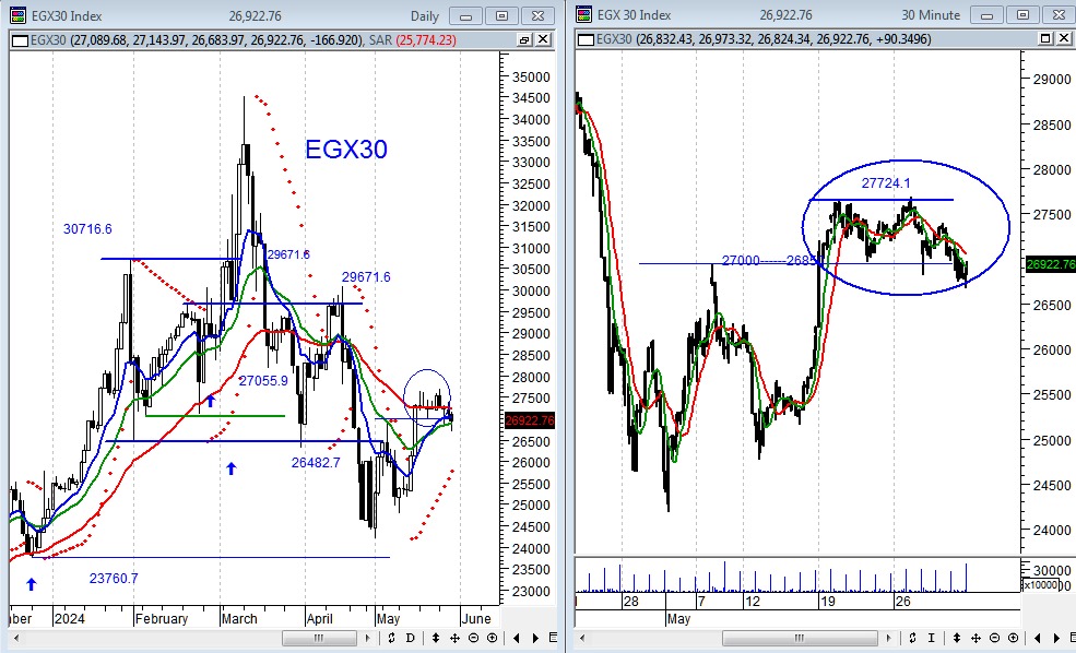 بالنظر الي الرسم البياني اليومي للمؤشر الرئيسي egx30 نجد ان القوي الشرائيه استطاعت السيطره علي زمام الامور وذلك بعد التغلب علي نظيرتها البيعيه باختراق مستويات المقاومه الرئيسيه لاعلي 26850مما ادي الي تغير الاتجاه الحالي العام للمؤشر الرئيسي من اتجاه عام هابط الي اتجاه عام صاعد وبناء عليه