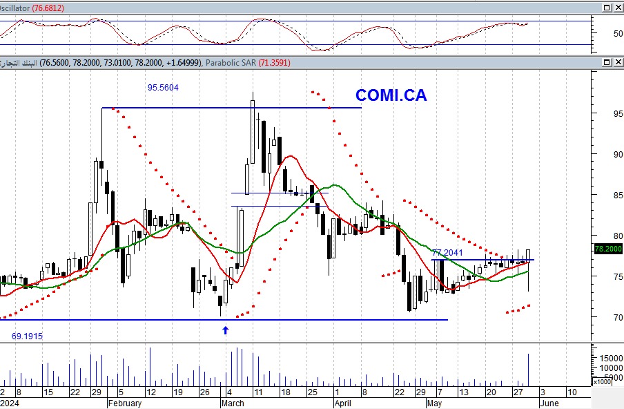 بالنظر إلى الرسم البياني لسهم التجارى الدولي نرصد أن هناك توازن بين القوى الشرائية ونظيرتها البيعية مما أدى إلى تحرك السهم في اتجاه عرضي على المدى قصير ومتوسط الأجل حده السفلي 69.20ج وهو الدعم الرئيسي للسهم وحده العلوي ٩٦ ج وهي المقاومة الرئيسية للسهم ،لذلك ننصح المستثمرين بعمل متاجرات بين الحدود السعرية للسهم