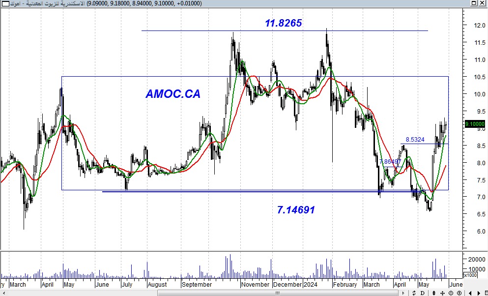 بالنظر إلى الرسم البياني لسهم اموك نرصد أن هناك توازن بين القوى الشرائية ونظيرتها البيعية مما أدى إلى تحرك السهم في اتجاه عرضي على المدى قصير ومتوسط الأجل حده السفلي 6.50 وهو الدعم الرئيسي للسهم وحده العلوي 10.00ج وهي المقاومة الرئيسية للسهم