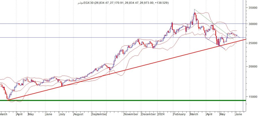 أغلق المؤشر العام EGX30 عند مستوى 26428 نقطة ويواجه المؤشر منطقة مقاومة عند 27200 ثم منطقة 27650 – 28500 نتوقع ان يبدا المؤشر في موجة صعودية الى هذه المستويات قبل ان يبدا في موجه جديدة من جني الارباح الى مستويات 26300 ثم 25200 في حال كسر منطقة الدعم القريبة عند 26500 ننصح بالمضاربة بين هذه المستويات و ننصح باستثمار الفرصة السانحة ويجب الالتزام بنظام حماية الارباح ووقف الخسارة السريع في حال حدوث اي تقلبات بسبب الظروف الحالية