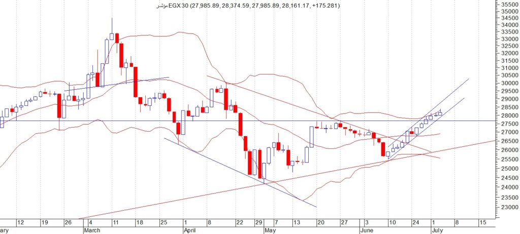 اغلق المؤشر العام EGX30 عند مستوى 28161 واستطاع المؤشر اختراق منطقة المقاومة الصعبة جدا عند 27700 ثم 27900 نتوقع ان يتجه المؤشر الى المستويات 28500 ثم 29000 ويعتبر مستوى 27700 هو منطقة الدعم القريبة والهامة للمؤشر الان ننصح بالمضاربة بين هذه المستويات و ننصح باستثمار الفرصة السانحة ويجب الالتزام بنظام حماية الارباح ووقف الخسارة السريع ويعتبركسر مستوى 27700 هو وقف الخسارة للمؤشر العام في حال حدوث اي تقلبات بسبب الظروف الحالية.