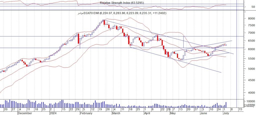 اغلق المؤشرEGX70 عند مستوى 6235 ويواجه المؤشر مقاومة صعبة عند منطقة 6300 ثم 6400 حيث يتحرك المؤشر في موجة صعودية الى هذه المستويات وتعتبر منطقة 6100 هي منطقة الدعم الاهم خلال هذه الفترة ننصح بالمضاربة بين هذه المستويات و ننصح باستثمار الفرصة السانحة ويجب الالتزام بنظام حماية الارباح ووقف الخسارة السريع في حال حدوث اي تقلبات بسبب الظروف الحالية.