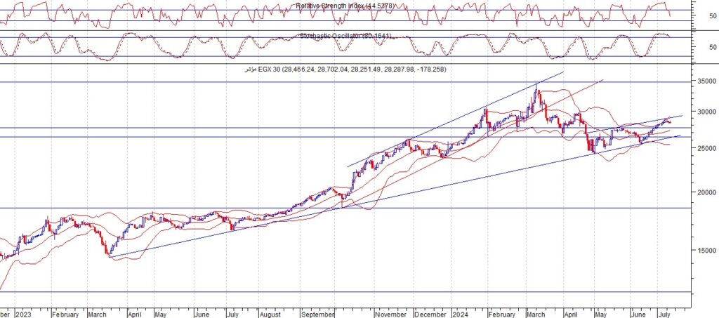 أغلق مؤشر egx30 عند مستوى 28287 ويعتبر مستوى الدعم 27700 هو الدعم الأهم خلال الاسبوع القادم أن شاء الله اذا استطاع الثبات فوقه والارتداد فإنه سيتحرك عرضيا بين 27700 و29200 ولكن في حال اختراق الدعم عند 27700 فإنه يتجه إلى الدعم التالي الذي يمثل الترند لاين المتحرك صعودا ويقابله عند مستوى 26500 ويعتبر هذا المستوى هو حد وقف الخسارة في حال تجاوزه هبوطا والثبات تحته ننصح بالمضاربة بين هذه المستويات و ننصح باستثمار الفرصة السانحة ويجب الالتزام بنظام حماية الارباح ووقف الخسارة السريع ويعتبركسر مستوى 26500 هو وقف الخسارة للمؤشر العام في حال حدوث اي تقلبات بسبب الظروف الحالية.