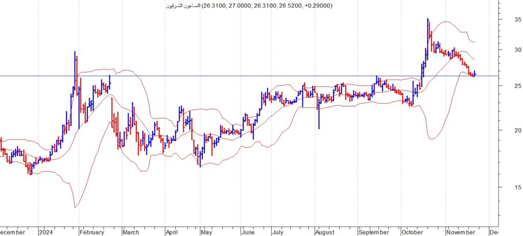 أغلق سهم النساجون الشرقيون عند مستوى 26.52 وقد عانى السهم هبوطا حادا من مستوى 35 جنية وهو مستوى مستهدف مقلوب راس وكتفين سابق واكمل السهم تصحيحه الى مستوى خط الرقبة لهذا النموذج عند 26.3 نتوقع ارتداد السهم صعودا خلال الاسبوع القادم ان شاء الله مستهدفا 28 جنية ثم 30 جنيه ان شاء الله مع اعتبار كسر مستوى 26 جنية هو حد وقف الخسارة .