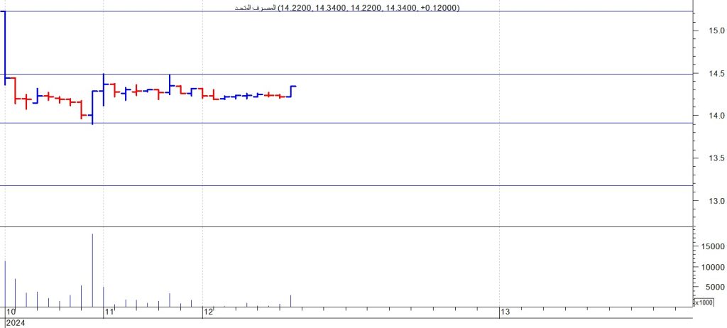 اغلق سهم المصرف المتحد عند مستوى 14.34 ويتحرك السهم عرضيا بين مستوى 13.9 – 14.5 ننصح بالمضاربة بين هذه المستويات ونتوقع اختراق السهم مستوى المقاومة عند 14.5 متجها الى 15.2 ثم 16 جنية ويعتبر الدعم الهام للسهم عند 13.9 وهو القريب من سعر الاكتتاب والذي في حال اختراقه هبوطا فانه يستهدف 13.1 ننصح بالمضاربة بين هذه المستويات.