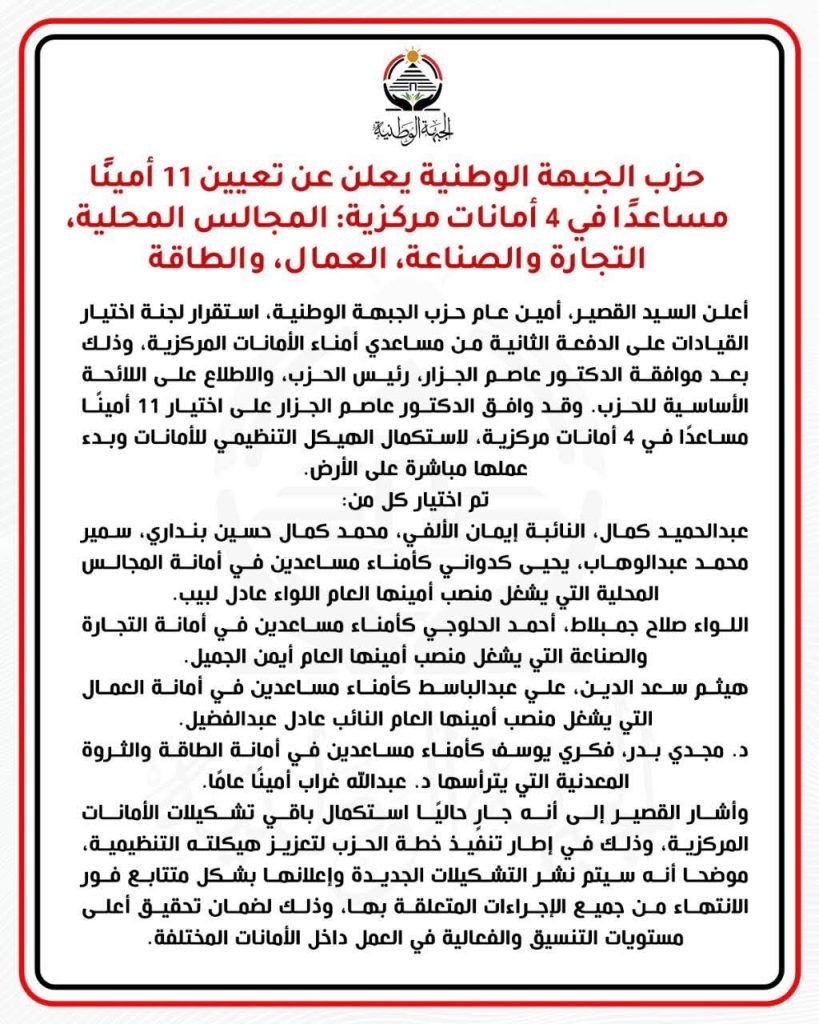 وأشار القصير إلى أنه جارٍ حاليًا استكمال باقي تشكيلات الأمانات المركزية، وذلك في إطار تنفيذ خطة الحزب لتعزيز هيكلته التنظيمية، موضحا أنه سيتم نشر التشكيلات الجديدة وإعلانها بشكل متتابع فور الانتهاء من جميع الإجراءات المتعلقة بها، وذلك لضمان تحقيق أعلى مستويات التنسيق والفعالية في العمل داخل الأمانات المختلفة.