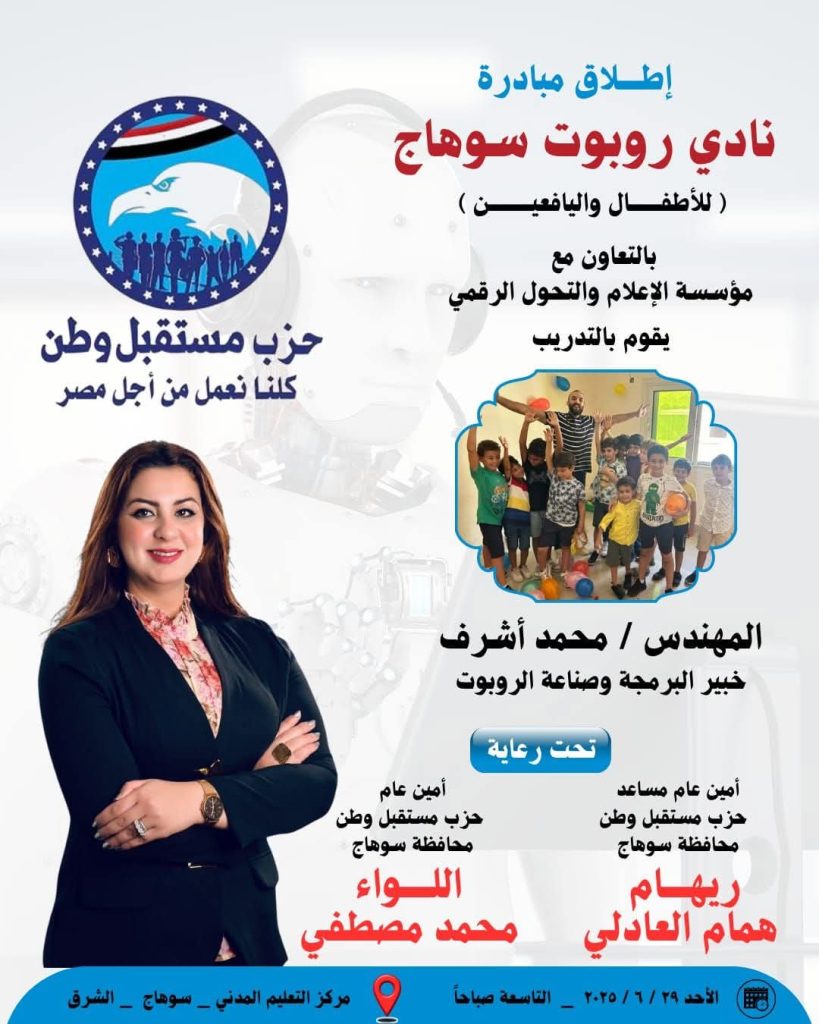 في خطوة غير مسبوقة على مستوى محافظات الجمهورية، وتحت مظلة حزب مستقبل وطن – أمانة محافظة سوهاج بقيادة اللواء محمد مصطفى، الأمين العام، وبرعاية الأستاذة ريهام همام العادلي، تنطلق في محافظة سوهاج مبادرة (نادي روبوت سوهاج)، المخصصة للأطفال واليافعين، وذلك بالتعاون مع مؤسسة الإعلام والتحول الرقمي بالقاهرة، كأول أفرع المبادرة المركزية “نادي روبوت مصر”.