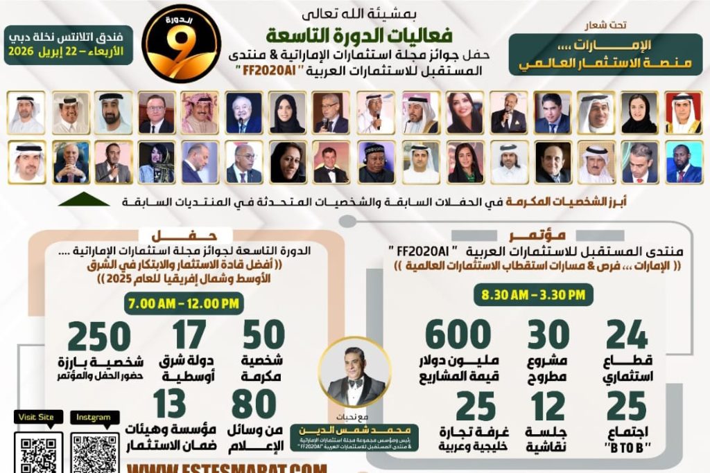 أعلنت مجموعة مجلة استثمارات الإماراتية عن انعقاد دورتها السنوية التاسعة تحت شعار: “الإمارات… فرص وإيدلوجيا استقطاب الاستثمارات”، يوم الأربعاء 22 أبريل 2026، في قاعة المؤتمرات الكبرى بفندق أتلانتس نخلة دبي، تحت مظلة منتدى المستقبل للاستثمارات العربية FF2020AI، أحد مبادرات المجموعة التي أُطلقت بعد جائحة كورونا.