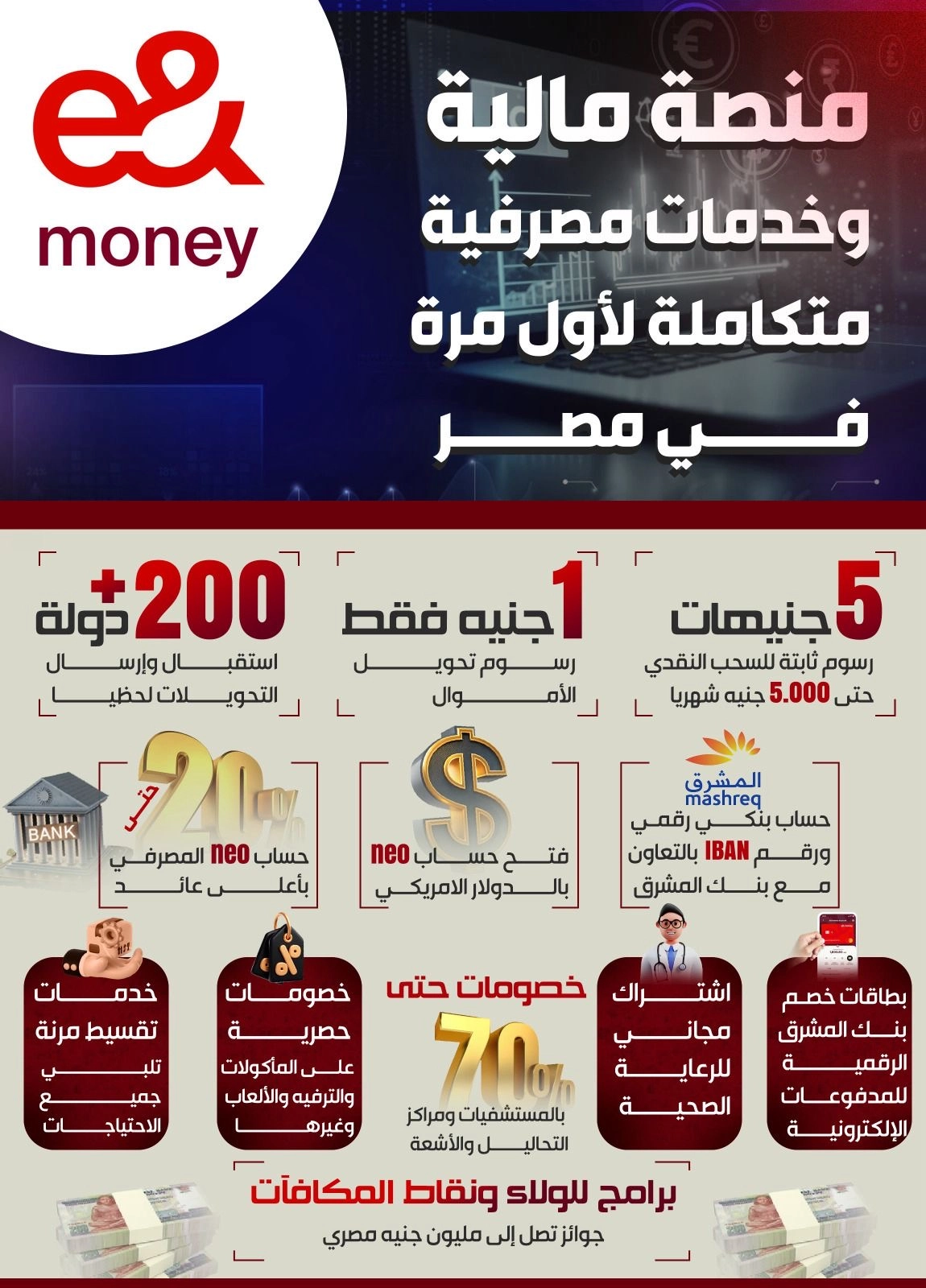 وترتقي “e& money” بخدمات المحافظ الرقمية إلى منظومة مالية متكاملة تجمع بين الخدمات المصرفية والرقمية بالتعاون مع بنك المشرق (Banking as a Service)، والتي تشمل فتح حساب مصرفي (إي اند مشرق نيو) بفائدة علي حسابات التوفير تصل إلى 20%، هي الأعلى في السوق المصري، والذي يُمكن العميل من الحصول على بطاقة ائتمان بمميزات تنافسية، وإمكانية فتح حساب بالدولار الأمريكي بسهولة، لإجراء و استقبال أي تحويلات دولية بكل سهولة ، هذا بالإضافة بإتاحة الفرصة لعملاء إي اند مشرق نيو بإجراء و استقبال التحويلات بالجنيه المصري لحظيًا.