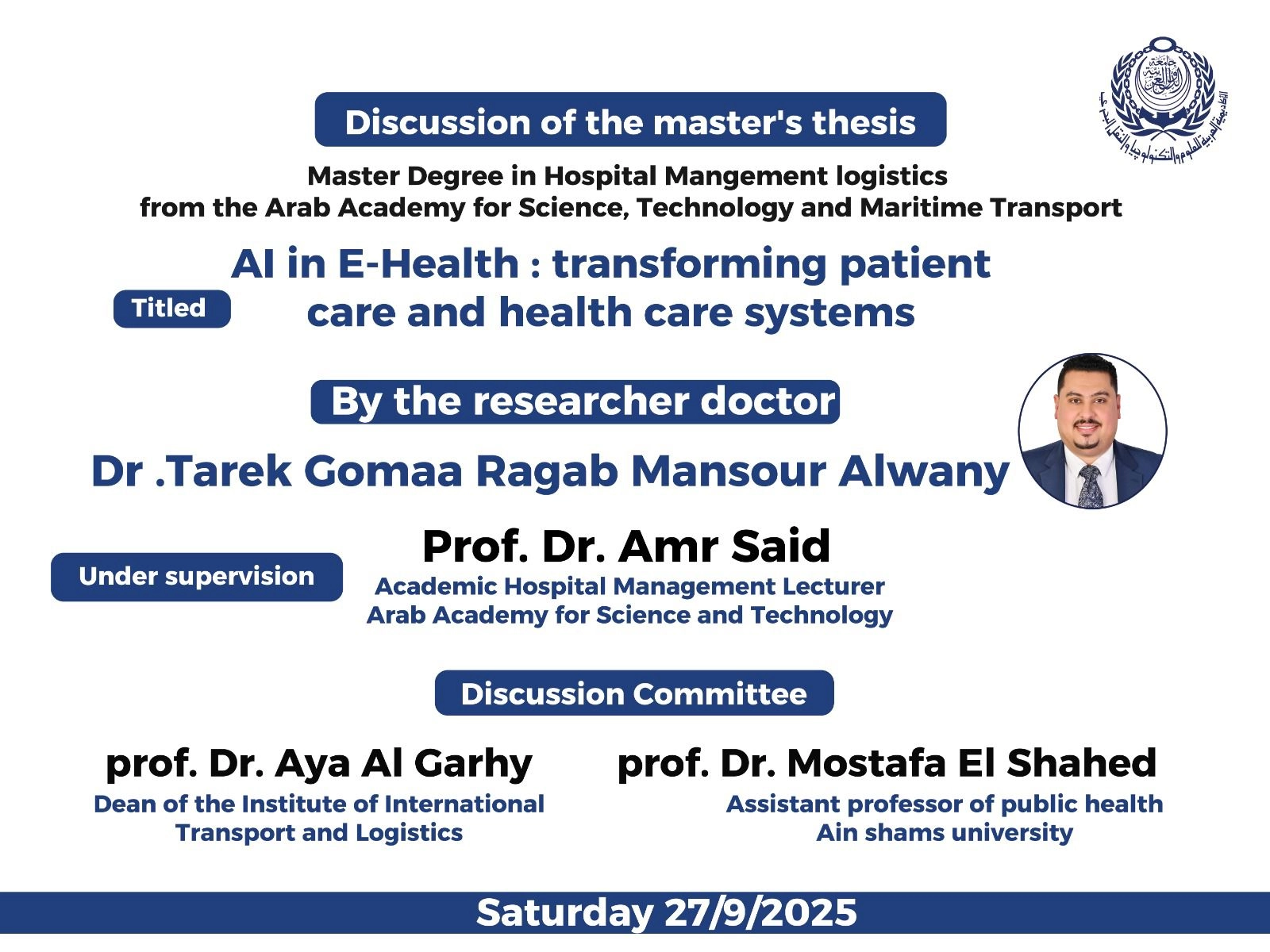 وضمَّت لجنة المناقشة والتحكيم كلاً من الدكتورة آية الجارحي، عميد كلية النقل الدولي واللوجستيات، والدكتور عمرو أمين سعيد، نائب رئيس الجهاز المركزي للمحاسبات ورئيس قسم لوجستيات إدارة المستشفيات بالكلية، والدكتور مصطفى الشاهد، أستاذ الصحة العامة بكلية الطب جامعة عين شمس.