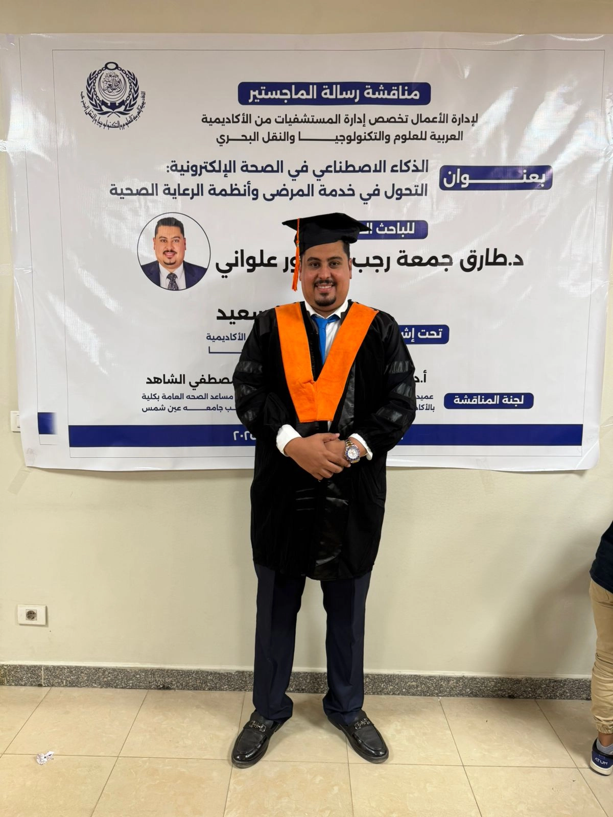 قدَّم الكاتب الصحفي مصطفى البلك، نائب رئيس تحرير جريدة الجمهورية، التهنئة إلى الدكتور طارق علواني، بمناسبة حصوله على درجة الماجستير في إدارة الأعمال بتقدير امتياز مع مرتبة الشرف، في تخصص لوجستيات إدارة المستشفيات، من الأكاديمية العربية للعلوم والتكنولوجيا والنقل البحري، عن رسالته العلمية المتميزة بعنوان: