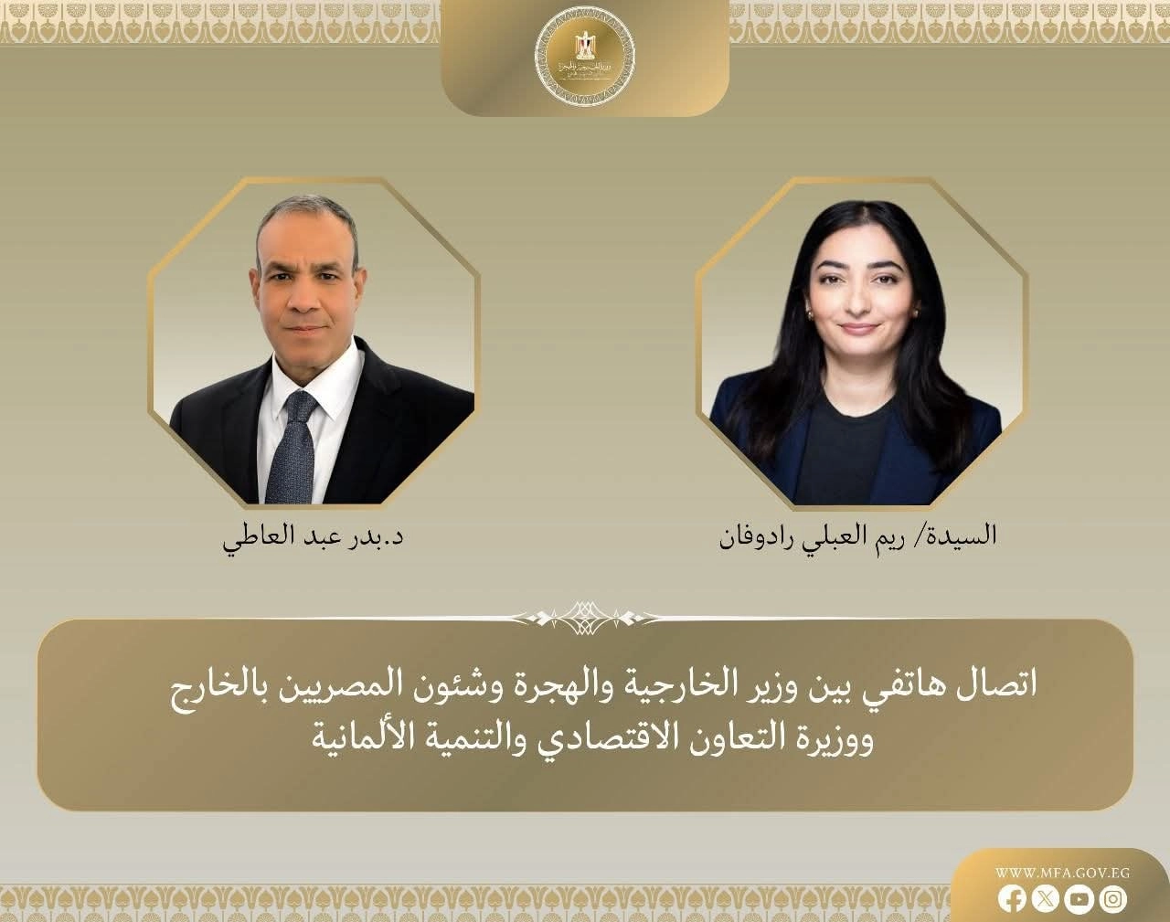 تلقى د. بدر عبد العاطي وزير الخارجية والهجرة وشئون المصريين بالخارج يوم الاثنين ٢٧ أكتوبر اتصالاً هاتفياً من السيدة “ريم العبلي رادوفان” وزيرة التعاون الاقتصادي والتنمية الألمانية.