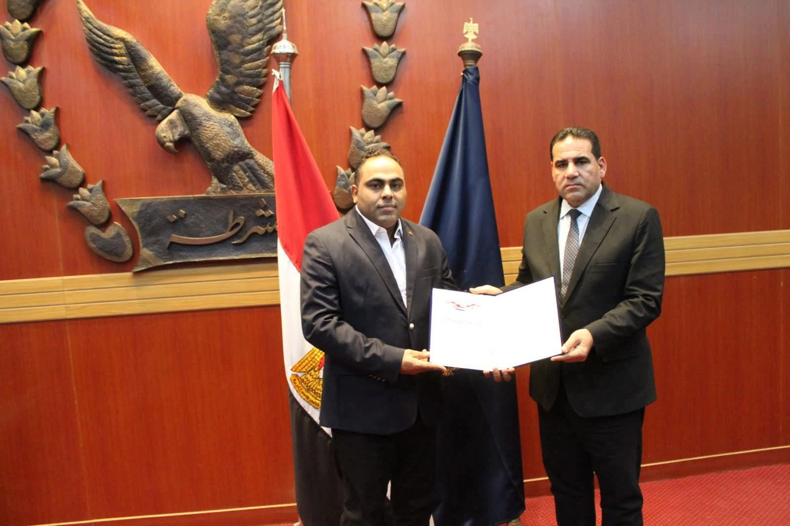 وقام اللواء حسن عبد العزيز، بتسليمه شهادة الشكر والتقدير، فى لفتة تؤكد أن المقدم إبراهيم صقر نموذج مشرف للضابط الواعي الذي يضع أمن المواطن فوق كل اعتبار.