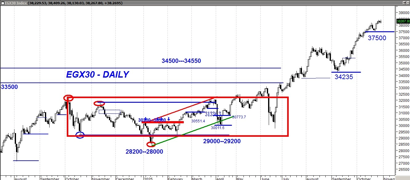 بالنظر إلى مؤشر EGX30 على الإطار اليومي، نجد أن القوى الشرائية مازالت هي المسيطر الأكبر على حركة المؤشر خلال الفترات الأخيرة، وهو ما انعكس في استمرار الاتجاه الصاعد القوي بعد نجاح السوق في اختراق مستويات المقاومة المحورية عند 36500 لاعلي ثم تأكيد اختراق 37500 مؤخرًا.