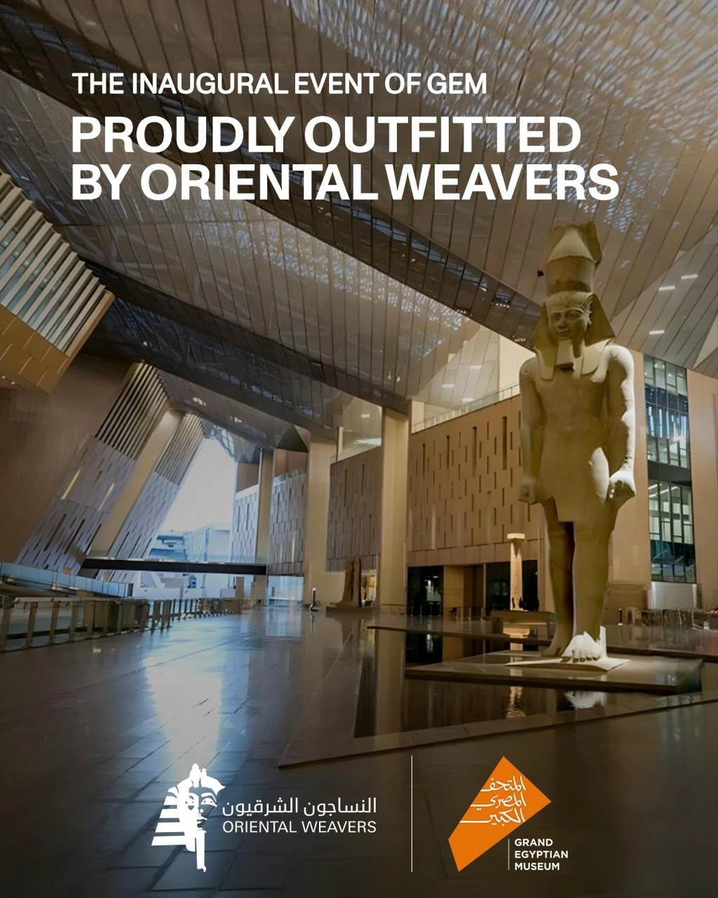 أعلنت شركة النساجون الشرقيون، الرائدة عالميًا في صناعة السجاد المنسوج، عن مساهمتها في فرش حفل افتتاح المتحف المصري الكبير – أحد أبرز المعالم الثقافية في العالم –بـ 40 ألف متر مربع من السجاد الفاخر المصنّع في مصر.