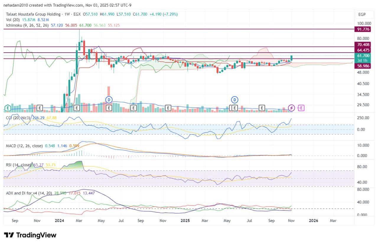 كشفت “نهاد علي” مدير التسويق و البيع في شركه “عربيه اون لاين”، لتداول الأوراق المالية، فى تحليلها الفني لآداء سهم “مجموعة طلعت مصطفى القابضة”، عن أن سهم “طلعت مصطفى القابضة ” (TMGH)، أحد الأوزان الثقيلة في البورصة المصرية، يشهد مرحلة حرجة من الناحية الفنية، بينما تدعم نتائجه الأساسية القوية بشكل غير مسبوق احتمالية انطلاقته الكبرى نحو مستويات سعرية قياسية. وقد جاء التحليل المزدوج (فني وأساسي) ليؤكد على فرص استثمارية كبيرة في السهم.
