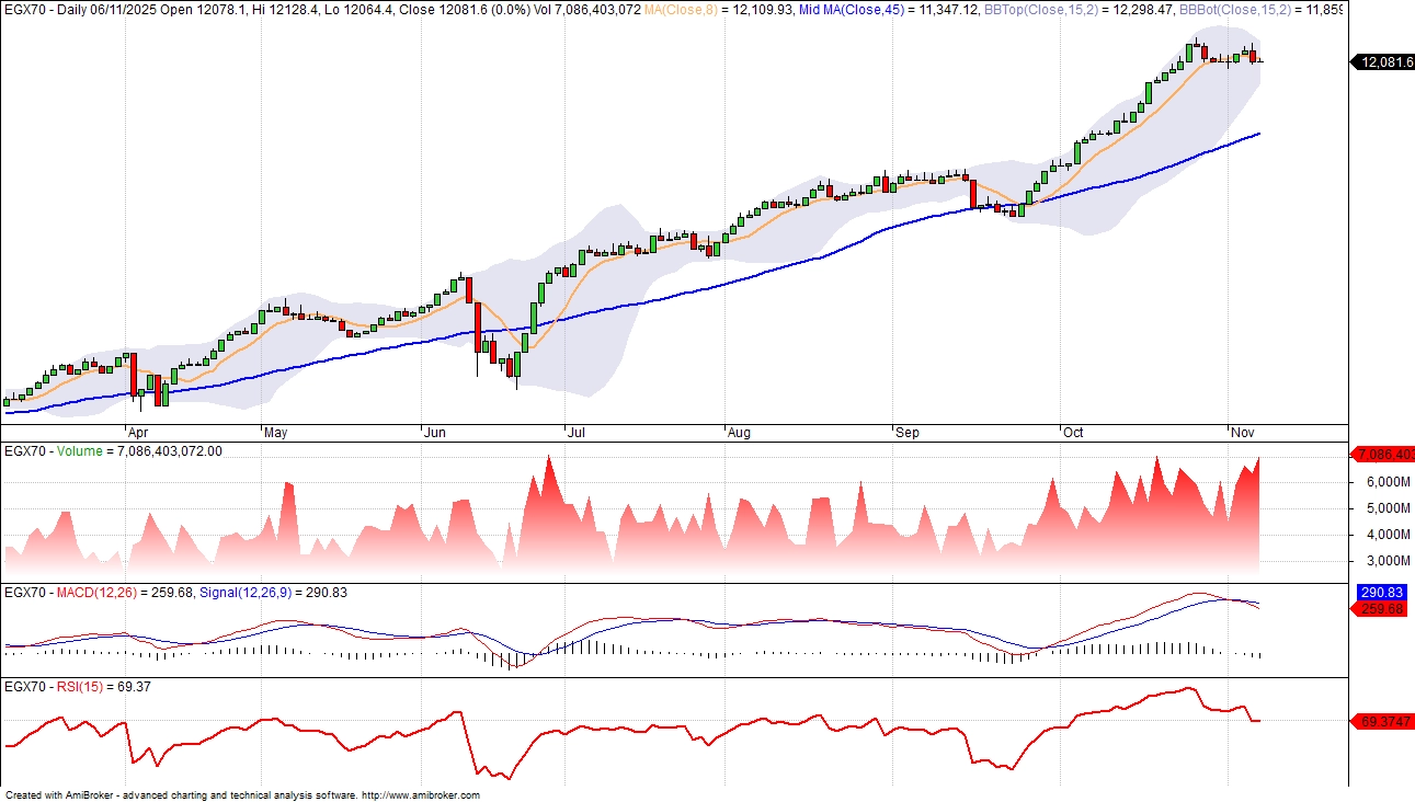 تغيرت المعادلة فى الإسبوع الماضى، حيث تفوق مؤشر EGX 30 على أداء هذا المؤشر، وسط إنتقال وظهور سيولة فى الإسهم القيادية، حيث لم يتغير إغلاق هذا الاسبوع عن سابقه عند مستوى 12081 نقطة، دون تحقق مستويات جديدة خلال هذا الاسبوع، ويتحرك المؤشر أعلى مستوى الدعم الهام 12000 نقطة، وكسره لأسفل يفتح الطريق أمام المرور بحركة تصحيحية للصعود السابق، يجد فيها مستويات الدعم 11600 نقطة ثم 11400 نقطة، وعلى الجانب الآخر يجد المؤشر مستويات المقاومة عند 12200 نقطة ثم 12340 نقطة، ويتحرك المؤشر فى إتجاه عرضى فى المدى القصير وصاعد فى المدى المتوسط.