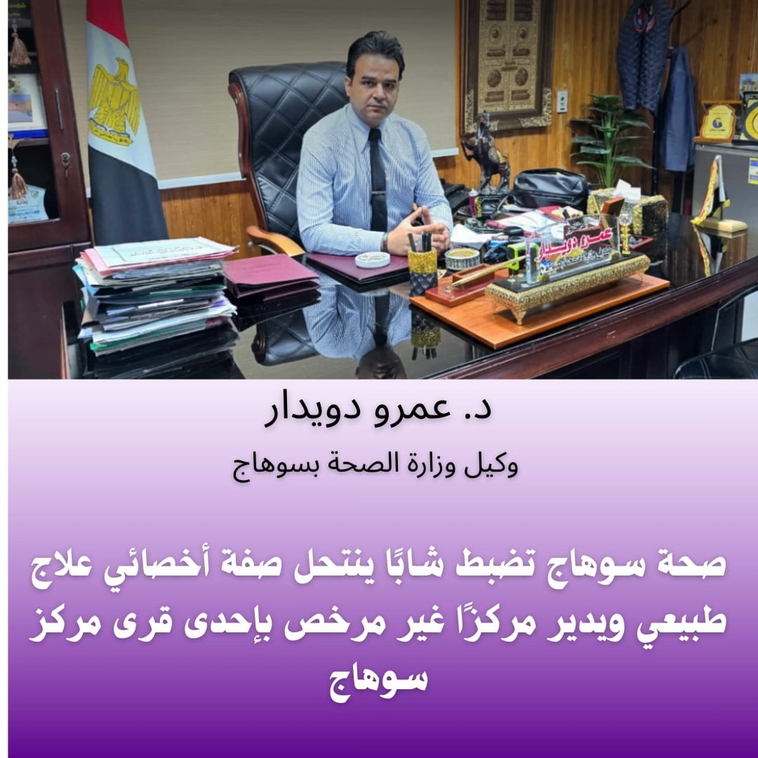 أكد السيد الدكتور عمرو دويدار وكيل وزارة الصحة بسوهاج، أن فرق التفتيش التابعة لإدارة العلاج الحر بمديرية الصحة، بالتنسيق مع إدارة سوهاج الصحية، وتحت إشراف الدكتور مصطفى رفعت مدير إدارة العلاج الحر، وبالتعاون مع الإدارة العامة للتموين والجهات المختصة، تمكنت من ضبط أحد الأشخاص يدعى (م.ع.أ) 33 عامًا، مقيم بقرية أولاد غريب بمركز سوهاج، حاصل على معهد متوسط، ويقوم بانتحال صفة أخصائي علاج طبيعي، ويدير مركز علاج طبيعي غير مرخص بذات التخصص و بنفس القرية
