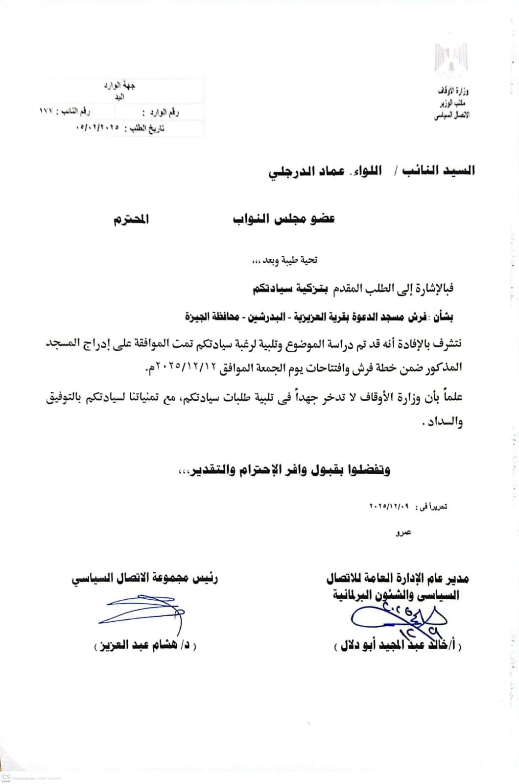 في إطار حرصه الدائم على متابعة مطالب وشكاوى أهالي دائرتي البدرشين والعياط، وضمن جهوده المستمرة للاهتمام بملف بيوت الله، أعلن النائب اللواء عماد عبدالتواب الدرجلي عن الحصول على موافقة السيد وزير الأوقاف على فرش وافتتاح مسجد الدعوة بقرية العزيزية بمركز البدرشين، وذلك يوم الجمعة الموافق 12/12/2025.