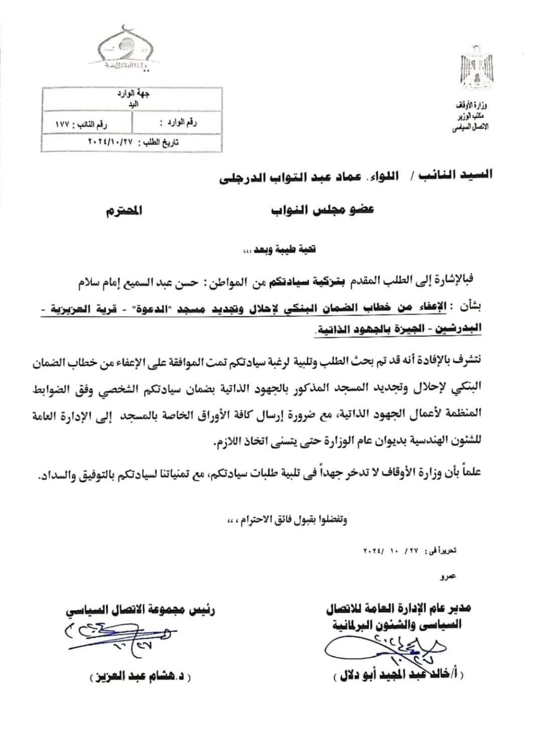 يُذكر أن مسجد الدعوة كان قد صدر بشأنه منشور سابق بإعفائه من خطاب الضمان البنكي، والموافقة على إحلاله وتجديده بالجهود الذاتية، بتاريخ 22/12/2024، في إطار دعم الدولة ووزارة الأوقاف لتيسير أعمال إعمار وتجديد بيوت الله.
