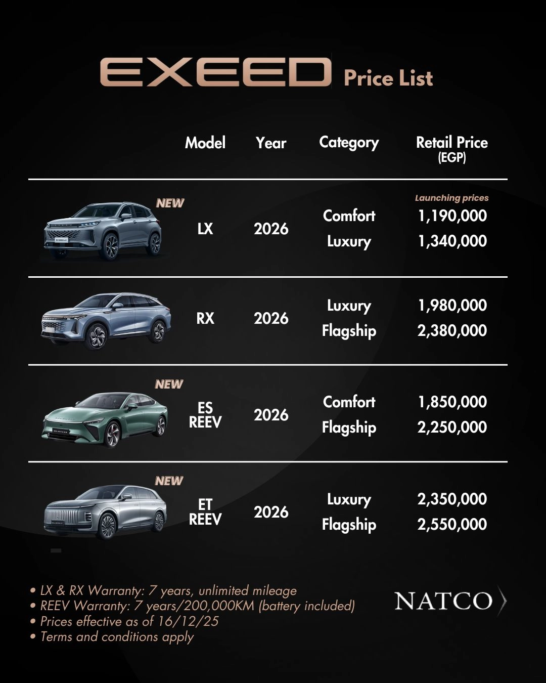 وبهذا الإطلاق، تعزز EXEED Egypt حضورها في سوق السيارات الفاخرة من خلال طرازات تجمع بين الأداء القوي والتقنيات الذكية وكفاءة القيادة، لتقدم لعملائها رؤية مستقبلية تتماشى مع توجهاتهم نحو التميز والاستدامة.