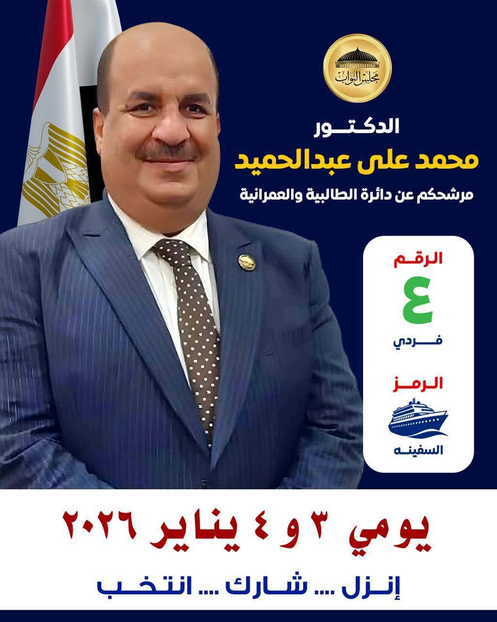 في إطار حرصه على دعم المشاركة السياسية وترسيخ الوعي الوطني، وجّه النائب الدكتور محمد علي عبدالحميد، مرشح عضوية مجلس النواب عن دائرة الطالبية والعمرانية (مستقل – رمز السفينة)، دعوة صادقة إلى أبناء الدائرة بضرورة المشاركة الإيجابية والفعالة في الانتخابات البرلمانية، مؤكدًا أن المشاركة تمثل حجر الزاوية في بناء دولة قوية ومؤسسات ديمقراطية راسخة.