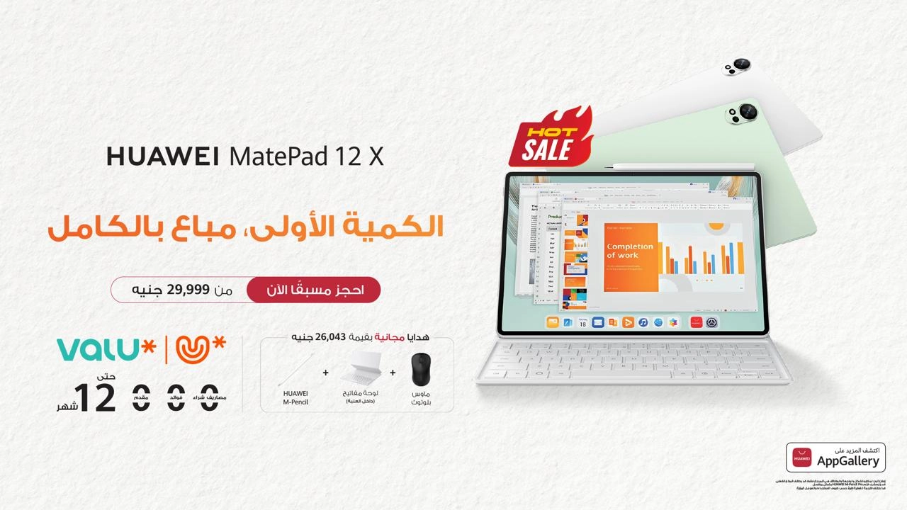 ولتعزيز سهولة الوصول، يمكن للمستخدمين الآن الحجز المسبق على جهاز HUAWEI MatePad 12 X بسعر يبدأ من 29,999 جنيه مصري لنسخة standard screen . ويُمكن للعملاء الحجز المسبق مع شركة ڤاليو بدون فوائد وبدون مقدم، مع خطط سداد مرنة تصل إلى 12 شهرًا. ويتوفر هذا العرض من خلال متاجر هواوي الرسمية، والمتجر الإلكتروني، وعدد من الموزعين المعتمدين.