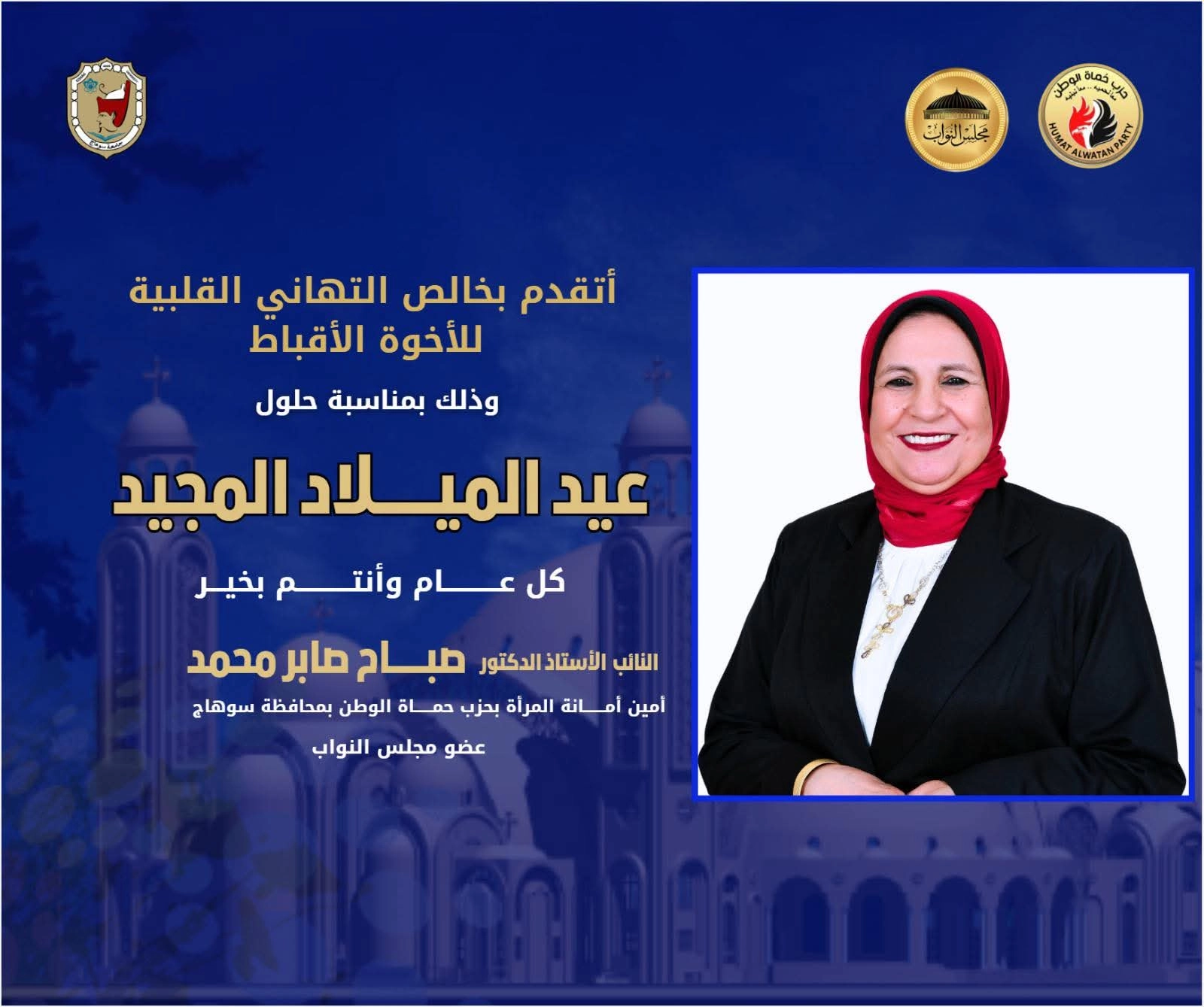 تقدمت النائبة الدكتورة صباح صابر، عضو مجلس النواب، بخالص التهاني القلبية إلى الإخوة الأقباط بمناسبة حلول عيد الميلاد المجيد، متمنية أن يعيده الله على مصر وشعبها بالخير والمحبة والسلام.