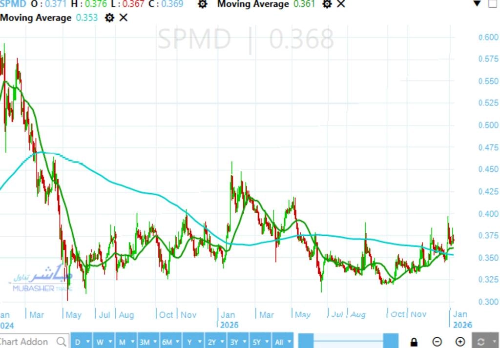 سجل سهم سبيد ميد يكال تقلبات ملحوظة خلال عام 2025، بدأ السعر بارتفاع ملحوظ مع زيادة في أحجام التداول في شهر يناير، وبداية من شهر أبريل، تعرض السعر لضغوط بيعية حتى شهر يونيو، وكان يتداول السعر داخل قناة هابطة، ولكن نجح مؤخرًا في الصعود من شهر يوليو حتى شهر يناير عام 2026، مخترقًا القناة الهابطة.