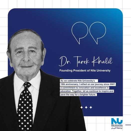 وبهذه المناسبة، وجّه الدكتور طارق خليل، الرئيس المؤسس لجامعة النيل، رسالة بمناسبة الذكرى التاسعة عشرة لتأسيس الجامعة، حملت عنوان «نتأمل رحلة الرؤية والتأثير»، قال فيها: بينما نحتفل بذكرى تأسيس جامعة النيل، أشعر بالفخر والامتنان للمراحل الرائعة التي وصلنا إليها منذ تأسيسنا في عام 2007.