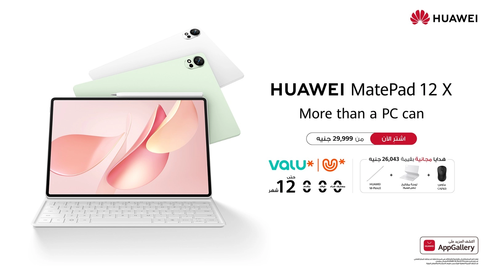 ولتعزيز سهولة الوصول، يمكن للمستخدمين الآن شراء جهاز HUAWEI MatePad 12 X بسعر يبدأ من 29,999 جنيه مصري لنسخة standard screen. ويُمكن للعملاء الشراء مع شركة ڤاليو بدون فوائد وبدون مقدم، مع خطط سداد مرنة تصل إلى 12 شهرًا. ويتوفر هذا العرض من خلال متاجر هواوي HES، والمتجر الإلكتروني، وعدد من الموزعين المعتمدين.