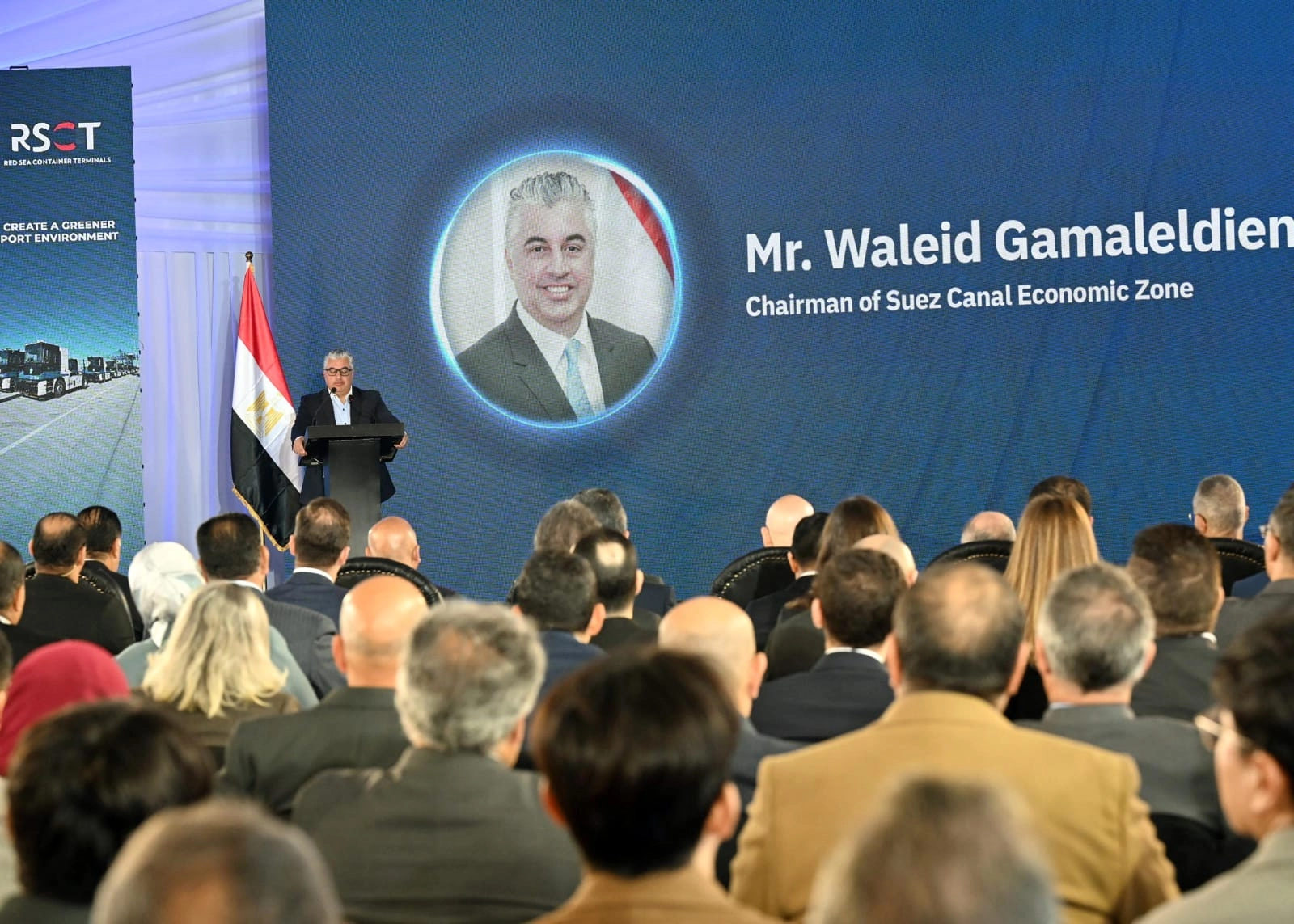 القى وليد جمال الدين، رئيس الهيئة العامة للمنطقة الاقتصادية لقناة السويس، كلمة اليوم خلال فعاليات انطلاق التشغيل التجاري لمحطة البحر الأحمر لتداول الحاويات رقم 1 (RSCT) بميناء السخنة، بحضور الدكتور مصطفى مدبولي، رئيس مجلس الوزراء، والفريق مهندس كامل الوزير، نائب رئيس مجلس الوزراء للتنمية الصناعية، وزير الصناعة والنقل، واللواء طارق الشاذلي، محافظ السويس، والفريق أسامة ربيع، رئيس الهيئة العامة لقناة السويس، واللواء نهاد شاهين، نائب وزير النقل للنقل البحري، واللواء محمد خليل، مدير مشروع تطوير واستكمال ميناء السخنة، والمهندس محمد فتحي، معاون الوزير للنقل البحري.