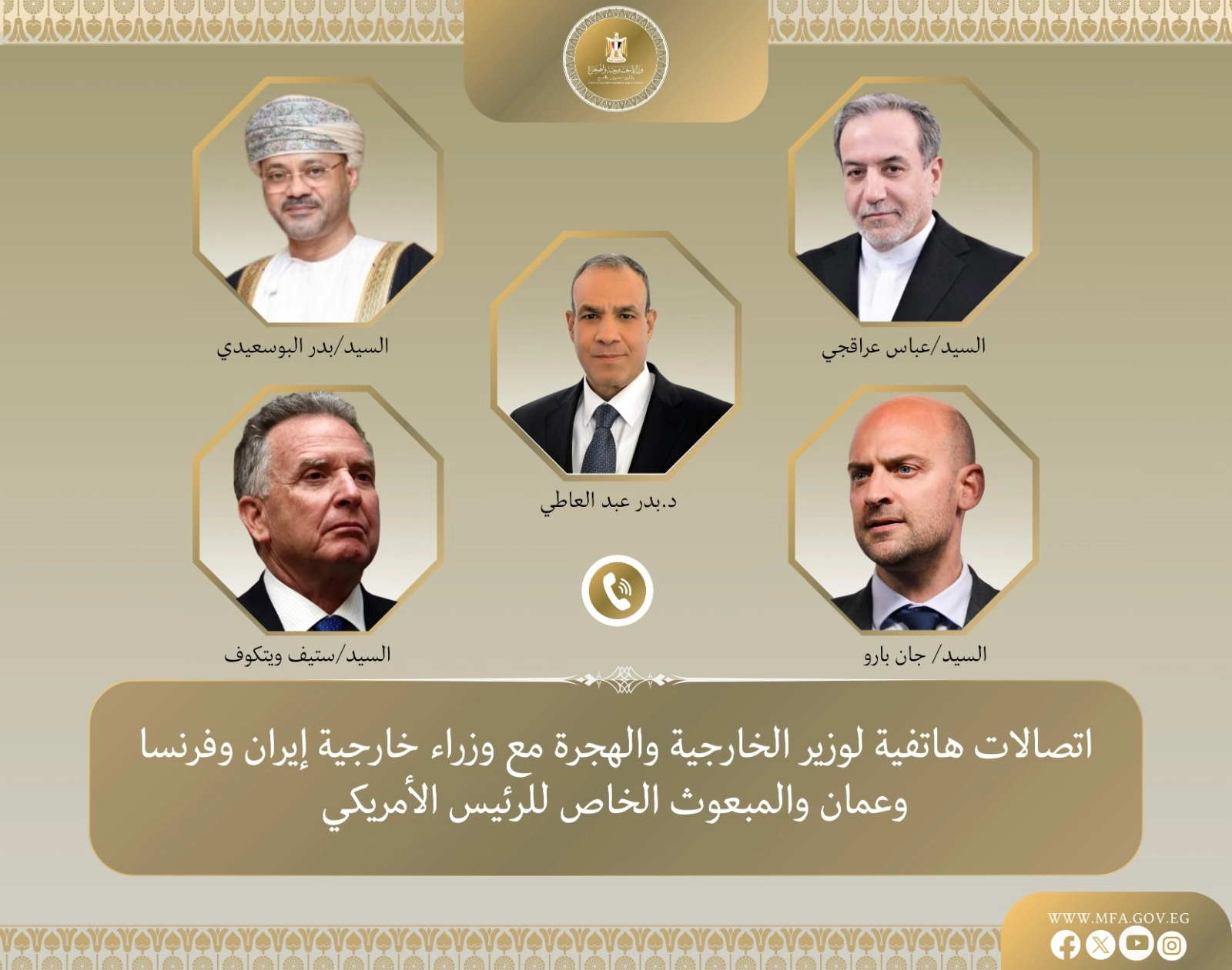بتوجيهات من السيد رئيس الجمهورية، جرت اتصالات مساء أمس ١٤ يناير بين د. بدر عبد العاطي، وزير الخارجية والهجرة وشئون المصريين بالخارج، والسيد جان-نويل بارو، وزير أوروبا والشئون الخارجية الفرنسي، والسيد بدر بن حمد البوسعيدي، وزير خارجية سلطنة عمان، والسيد عباس عراقجي، وزير الخارجية الإيراني، والسيد ستيف ويتكوف، المبعوث الأمريكي الخاص للشرق الأوسط.