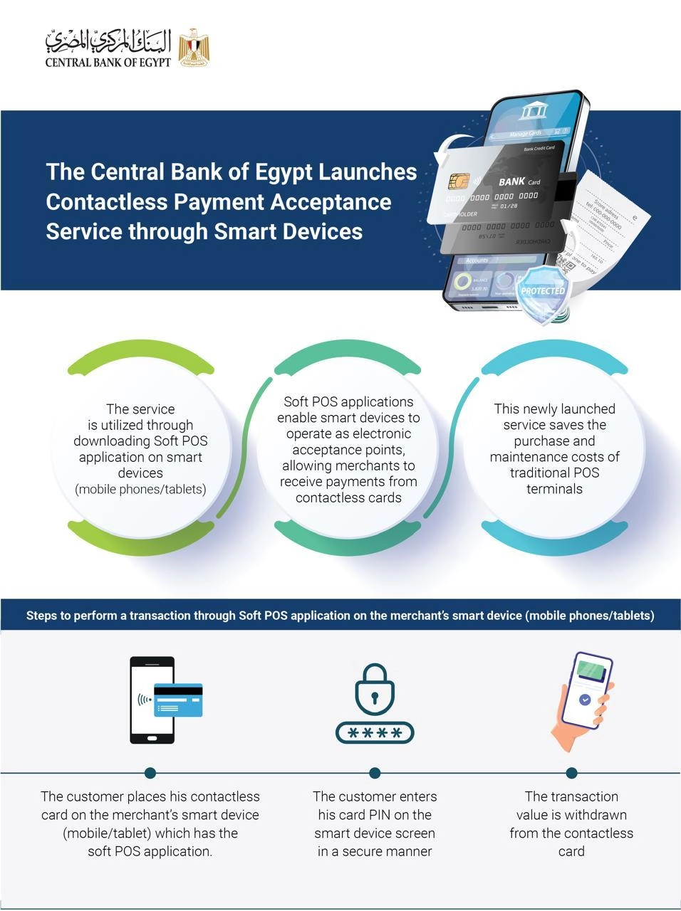 أعلن البنك المركزي المصري عبر الحساب الرسمي على موقع «فيس بوك»، إطلاق خدمة قبول المدفوعات الإلكترونية «اللاتلامسية» عبر الأجهزة الذكية «الموبايل / التابلت» باستخدام تطبيقات Soft POS، وذلك في إطار إستراتيجية التحول نحو مجتمع أقل اعتمادًا على النقد وتعزيز الشمول المالي، وتحقيق رؤية مصر 2030.