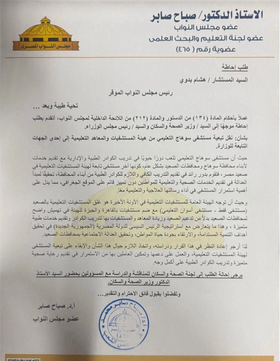 تقدّمت النائبة صباح صابر عضو مجلس النواب، بطلب إحاطة موجّه إلى السيد الدكتور وزير الصحة والسكان والسيد الدكتور رئيس مجلس الوزراء، بشأن قرار نقل تبعية مستشفى سوهاج التعليمي من الهيئة العامة للمستشفيات والمعاهد التعليمية إلى إحدى الجهات التابعة لوزارة الصحة.