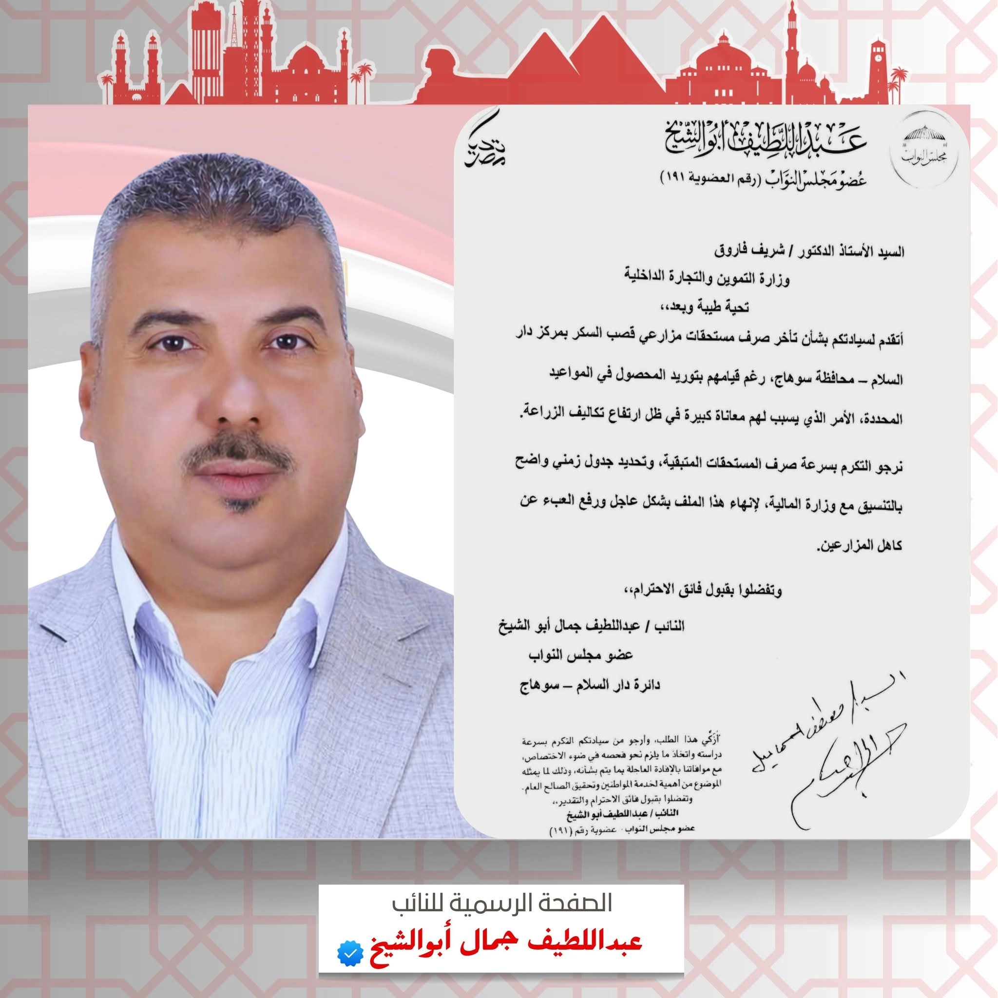 في إطار دوره الرقابي وحرصه الكامل على صون حقوق المزارعين، تقدّم النائب عبداللطيف جمال أبو الشيخ، عضو مجلس النواب عن دائرة دار السلام بمحافظة سوهاج، بطلب رسمي إلى الدكتور شريف فاروق وزير التموين والتجارة الداخلية، بشأن سرعة صرف مستحقات مزارعي قصب السكر المتأخرة.