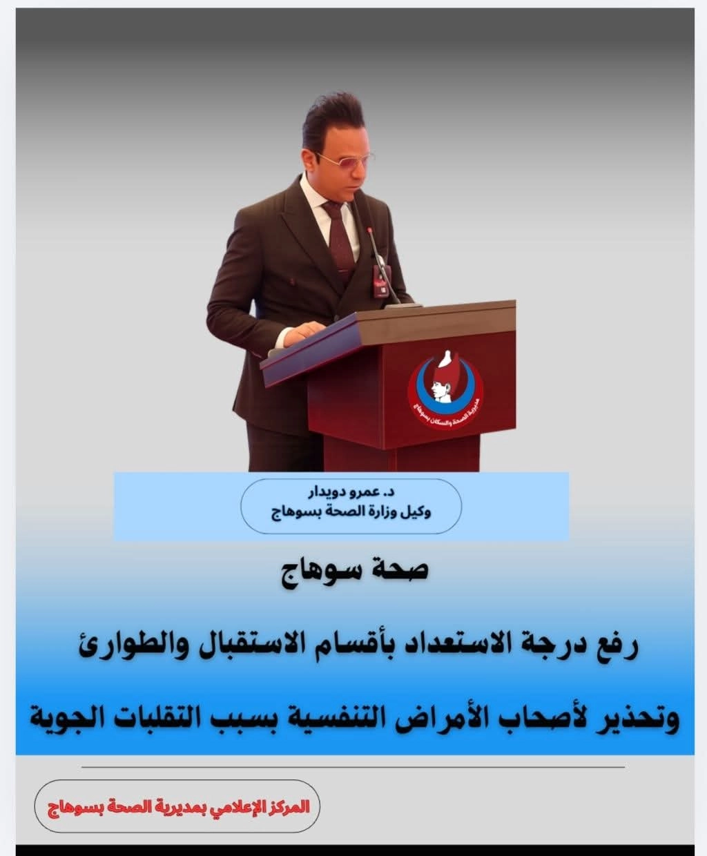 أعلن السيد الدكتور عمرو دويدار وكيل وزارة الصحة بسوهاج، رفع درجة الاستعداد بجميع أقسام الاستقبال والطوارئ بمستشفيات المحافظة، تزامناً مع حالة عدم الاستقرار في الأحوال الجوية التي تشهدها المحافظة خلال هذه الفترة و تنفيذاً لتوجيهات الأستاذ الدكتور خالد عبدالغفار وزير الصحة والسكان و معالي اللواء طارق راشد محافظ سوهاج