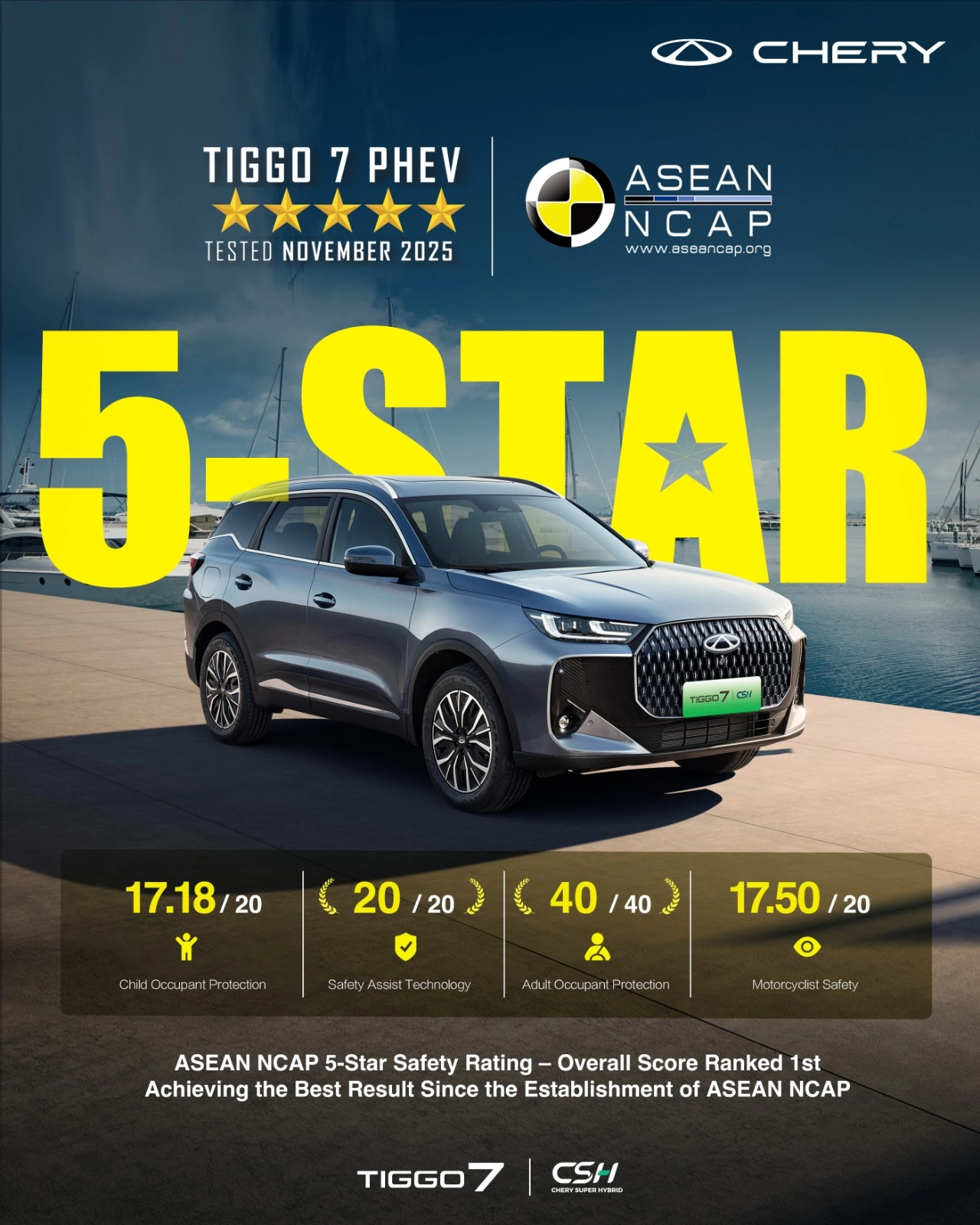 في أكتوبر 2025، حصلت TIGGO7 CSH على تصنيف الخمس نجوم في أحدث جولات اختبارات Euro NCAP، بعدما سجلت أداءً متوازنًا في أربع فئات رئيسية: حماية الركاب البالغين (82%)، حماية الأطفال (85%)، حماية مستخدمي الطريق الأكثر عرضة للخطر (80%)، وأنظمة المساعدة على السلامة (78%)، وهو ما يعكس قوتها الشاملة في مجالي السلامة النشطة والسلبية.