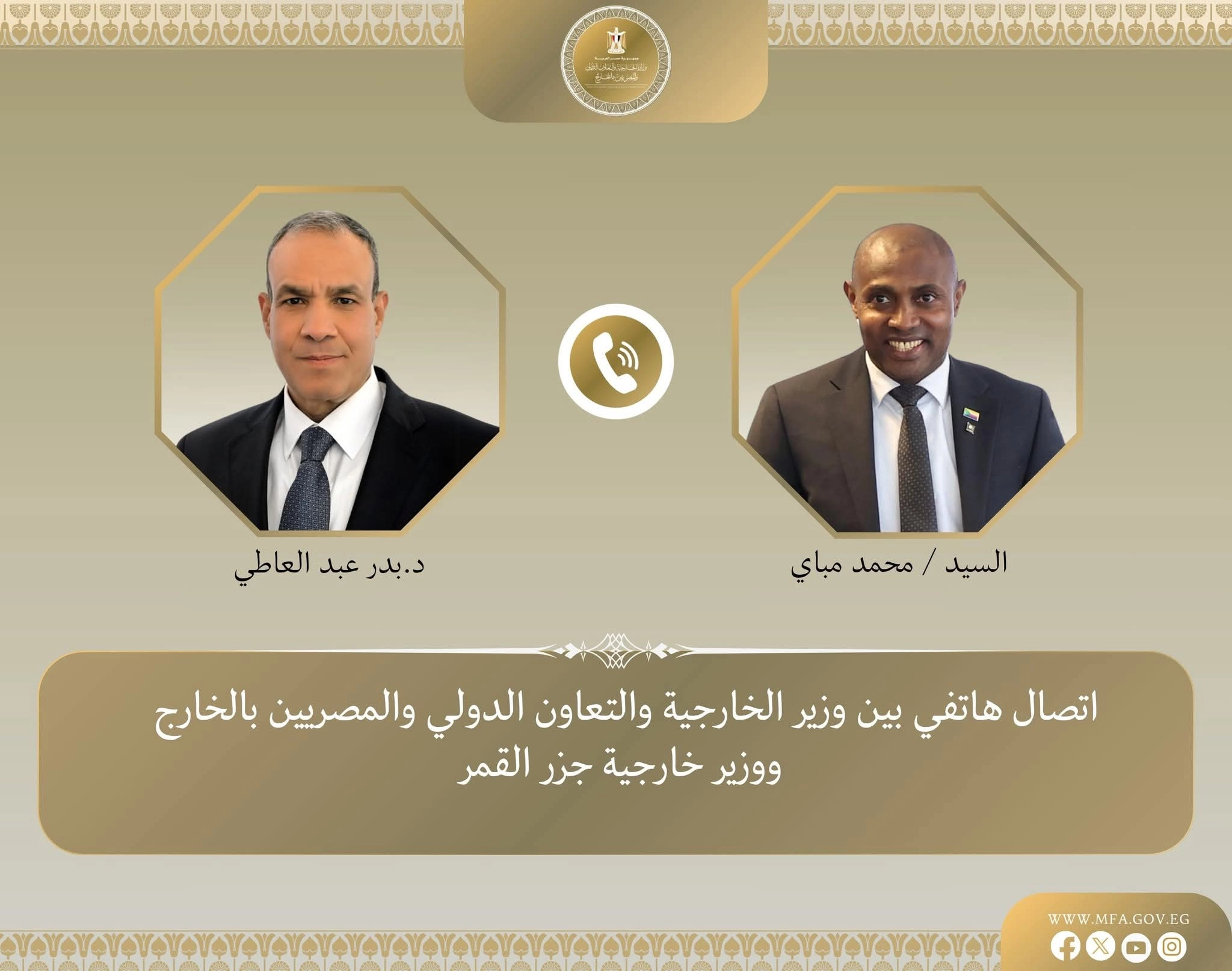 تلقى د. بدر عبد العاطي وزير الخارجية والتعاون الدولي والمصريين بالخارج، يوم الأربعاء ١٨ مارس اتصالاً هاتفياً من السيد محمد مباي وزير خارجية جزر القمر لبحث تطورات الأوضاع في منطقة الشرق الأوسط وجهود خفض التصعيد الاقليمي