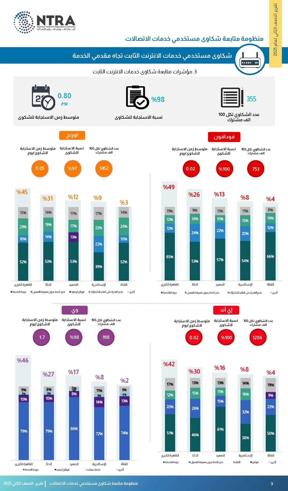 بلغ معدل شكاوى الإنترنت الثابت 355 شكوى لكل ١٠٠ ألف مشترك، وبلغت نسبة الاستجابة للشكاوى بعد التصعيد للجهاز 98%، كما بلغ متوسط وقت الاستجابة للشكوى 0.80 يوم.