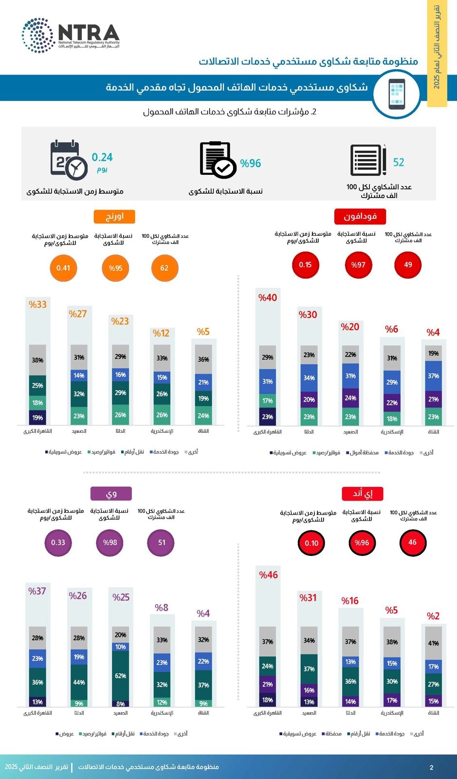 في إطار حرص الجهاز القومي لتنظيم الاتصالات على دعم حقوق المستخدمين وضمان تقديم خدمات اتصالات ذات جودة في السوق المصري، أصدر الجهاز تقرير منظومة متابعة شكاوى مستخدمي خدمات الاتصالات عن النصف الثاني لعام 2025، والذي يعرض أهم المؤشرات المتعلقة بشكاوى مستخدمي خدمات الهاتف الثابت والمحمول والإنترنت الثابت وأجهزة التليفون المحمول، ونسبة ووقت الاستجابة لشكاوى العملاء بعد تصعيدها للجهاز القومي لتنظيم الاتصالات.