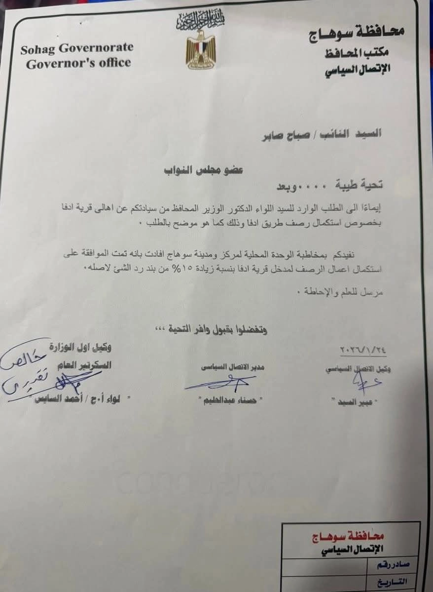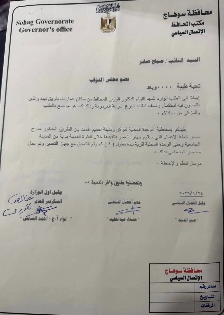 في إطار الدور الخدمي والرقابي لنواب البرلمان، وحرصًا على الاستجابة الفورية لمطالب المواطنين، تقدّمت النائبة الدكتورة صباح صابر، عضو مجلس النواب وعضو لجنة التعليم العالي والبحث العلمي، بطلبٍ عاجل إلى السيد اللواء الدكتور الوزير طارق راشد، محافظ سوهاج، بشأن سرعة استكمال أعمال رصف مدخل قرية ادفا، إلى جانب استكمال رصف امتداد شارع الترعة المردومة بنطاق مركز أخميم.
